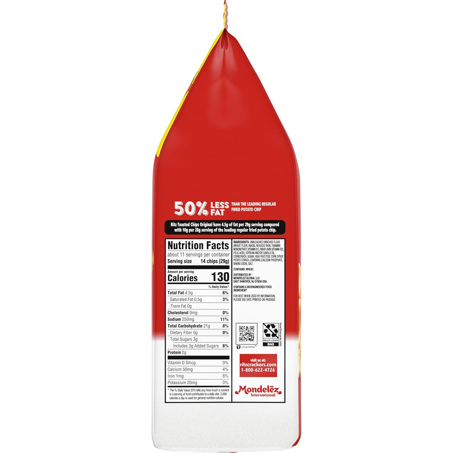 RITZ Original Toasted Chips are a crispy, crunchy twist on the classic cracker you know and love. These oven baked chips are toasted, not fried, so they contain 50 percent less fat per serving than the leading regular fried potato chips. Pack these snack chips in lunchboxes for a crunchy companion to sandwiches, or add them to your snack food shelf as a tasty after school treat. Great with dips, serve RITZ Chips at your next holiday party alongside your favorite meats, cheese and veggies on a festive charcuterie board or serve them on their own during your next game night. RITZ toasted cracker bags are sealed to lock in freshness making them ready to share with friends and family.