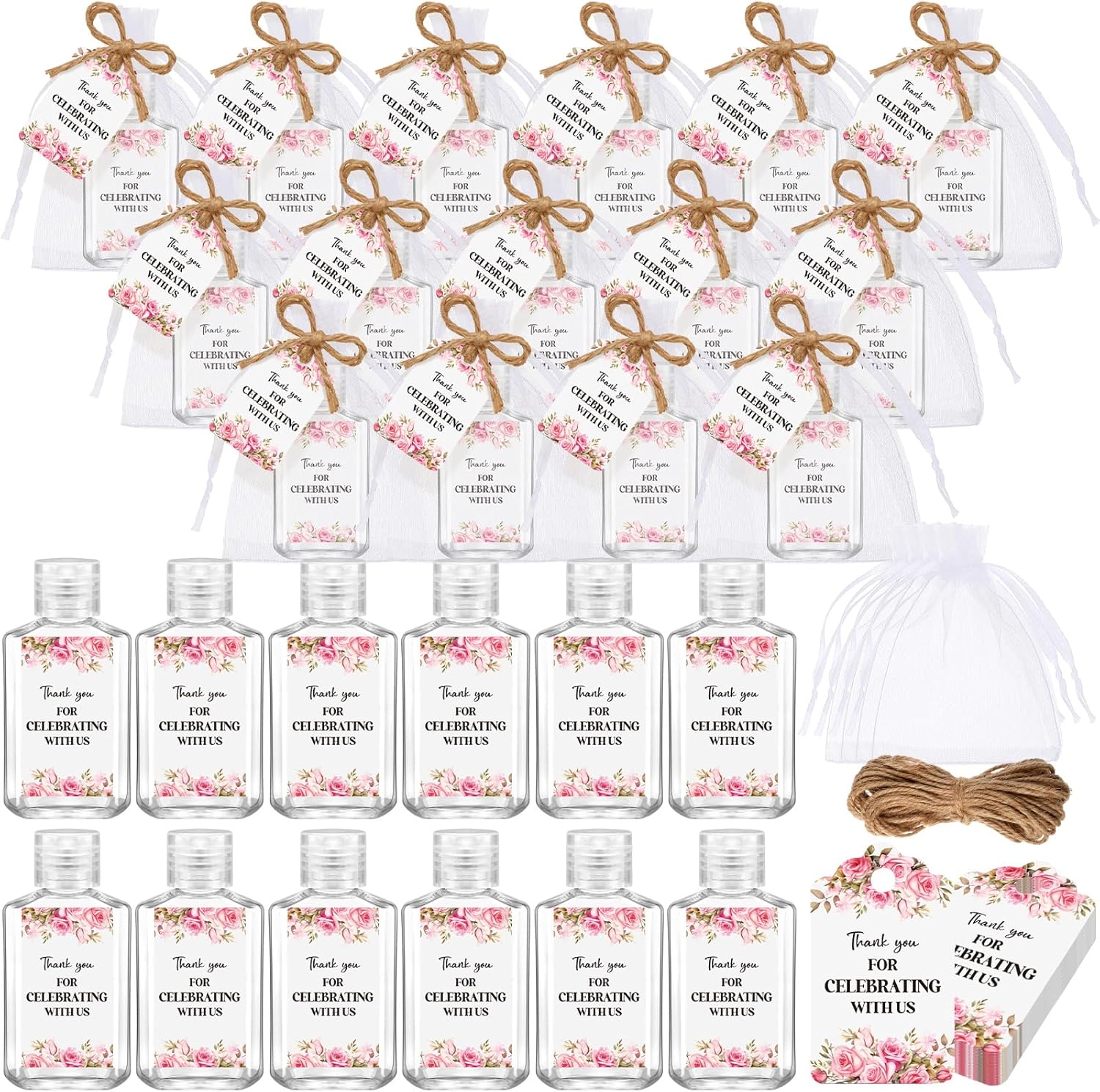 Features: The package of mini sanitizer bottles includes a 10.94-yard roll of rope, allowing you to add personal touches to your party favors. Tie it around the organza bags, attach tags, or use it to create delightful decorative elements. Your imagination is your limit when it comes to utilizing this versatile rope. Each of tiny travel containers comes in an exquisitely made white organza bag measuring approximately 3.94 x 5.91 inches. These stylish bags beautifully present the bottles, adding a touch of luxury to your wedding decoration while providing an exquisite souvenir for your beloved guests. Specifications: Material: plastic Color: clear Capacity: about 2 oz/ 60 ml Size: Organza bag: about 3.94 x 5.91 inches/ 10 x 15 cm Rope: about 10.94 yd/ 10 m Bottle: about 1.77 x 3.39 inches/ 45 x 86 mm Tag: about 2.36 x 1.57 inches Package includes: 50 x Mini hand sanitizer bottles 50 x Thank you tags 50 x White organza bags 1 Roll of rope Notes: Manual measurement, please allow slight errors on size. The color may exist a slight difference due to different screen displays